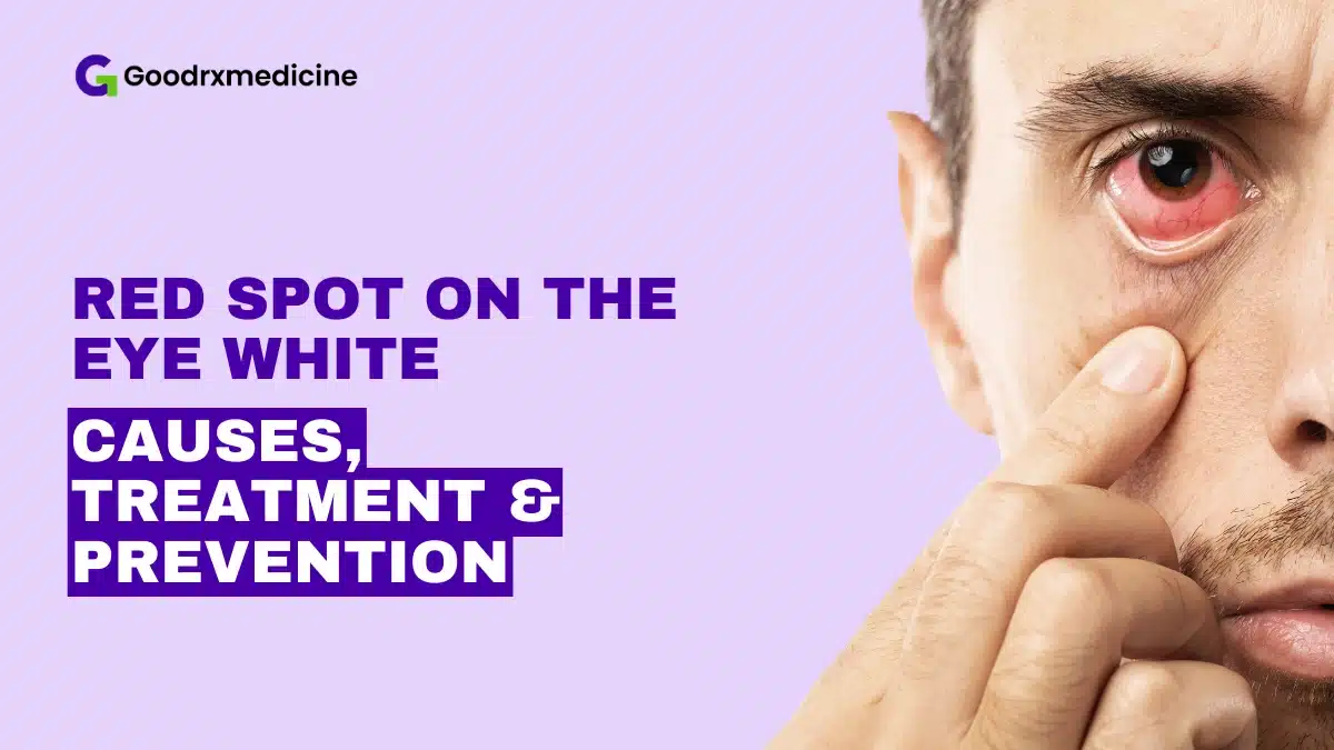 A red spot in the eye, known as a Subconjunctival Hemorrhage, is normally caused by the breakage of tiny blood vessels in the conjunctiva. The other causes include increased blood pressure, eye injury, blood thinning medication, and more.
